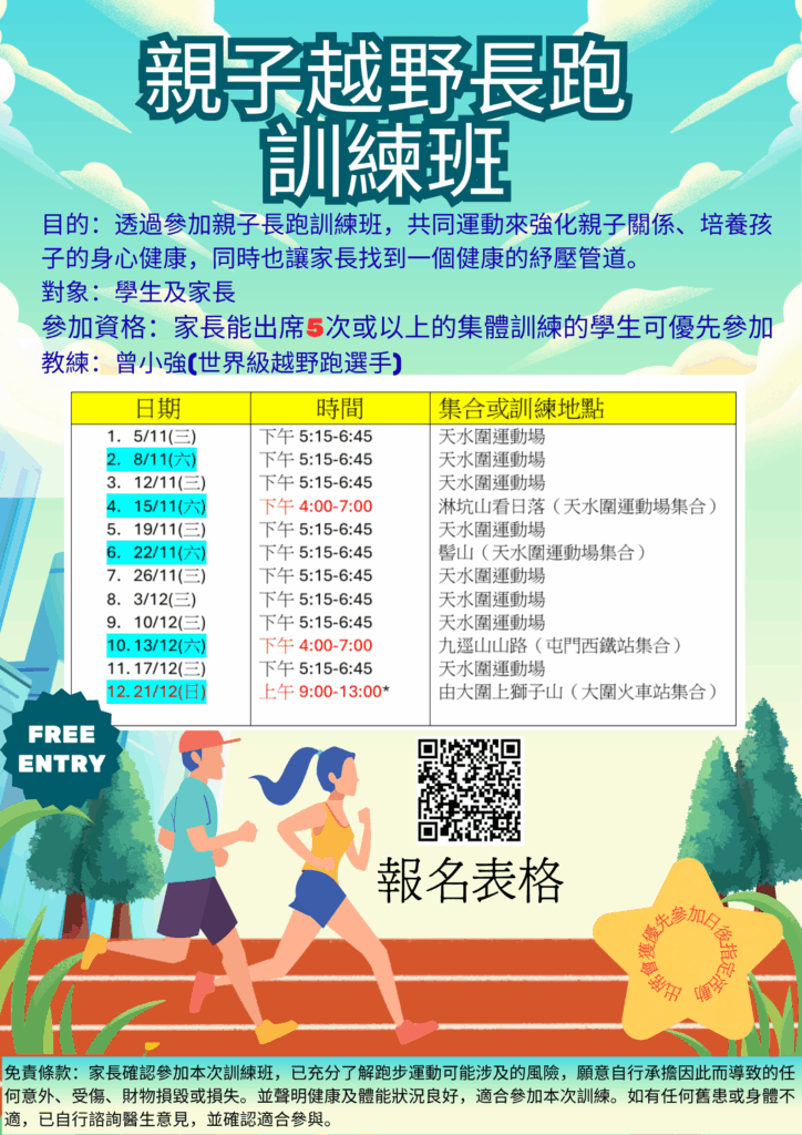 如有興趣參加由輔導組舉辦的家長教育活動:親子越野長跑訓練班,請按下連結報名,成功獲選將於10月獲發ECLASS電子通告報名。