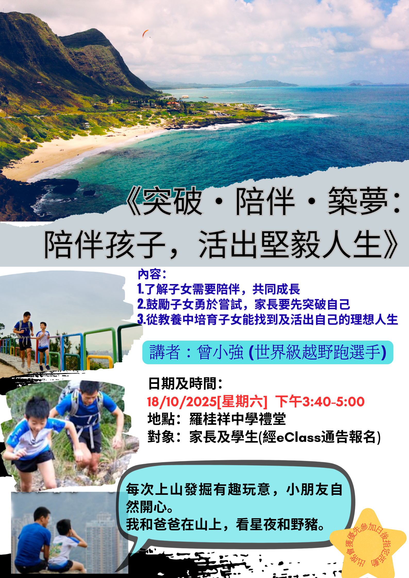 無論你是否有興趣與子女一齊參加由曾小強教練負責的親子越野長跑訓練班,鼓勵你和另一半出席以下講座,學習令「親子關係」穩固的方法,解決家庭問題由重視家長教育開始!